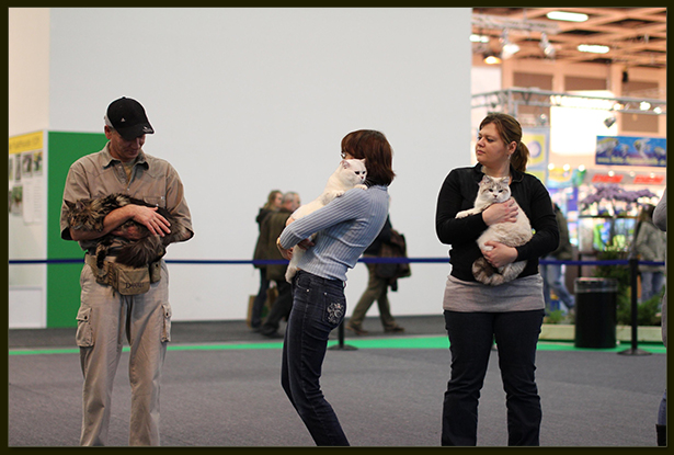 Dann kam eine wirklich aus teckelsicht sehr interessante Vorstellung. Der Berliner Pro-Kat - Verein für Katzenfreunde e.V. stellte seine Miezekatzen etwas genauer vor, sie liefen sogar teilweise an einer Leine und Brustgeschirr im Ring umher. Frauchen hatte mich vorsichthalber in unserem Stand festgemacht, er war nur von einer ca. 50cm Balustrade umgeben und sie traute mir altem Teckelsenior irgendwie nicht (kann mir gar nicht vorstellen, warum), aber ich hörte sehr aufmerksam zu und versuchte die Katzen zu beobachten, was gar nicht so einfach war, weil ziemlich viele Leute vor meiner Nase standen und ausführlich den Worten des Präsidenten des Katzenvereins lauschten. |