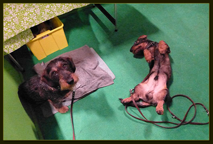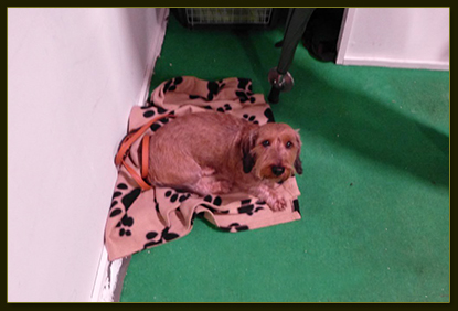 Nach 4 Stunden kam dann unsere Ablösung in Form von Rauhhaarteckel-Dame Facy und ihrem Sohn Atomic, sowie Frauchen Bettina, wir haben dann noch einen Moment unsere Erlebnisse ausgetauscht und ich habe Facy noch ein paar Ratschläge in Sachen Knuddel- und Streichelkattacken mit auf dem Weg gegeben. Dann bin ich mit Frauchen zum Ausgang und ab nach Hause. |