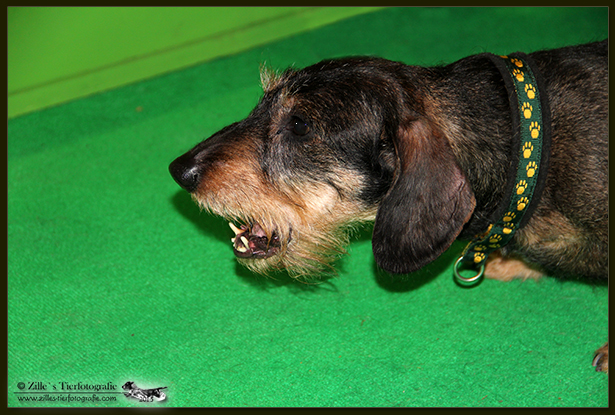 In der Zwischenzeit kamen auch ganz viele Leute bei uns vorbei und irgendwie haben sie mich immer sofort erkannt und riefen ganz entzückt, "oh ein Rauhhaardackel, ein Waldi und was für ein schöner", so hatte ich im Laufe des Vormittags doch viele neue Namen bekommen. Sie fragten Frauchen über unsere Rasse aus und ob es wirklich wahr ist, dass wir so einen Dickkopf haben. Oft kam auch die Frage ob wir zur Stöberjagd und zur Nachsuche eingesetzt werden können. Alles kein Problem, machen wir wirklich perfekt und manche von uns auch mit sehr großer Ausdauer und Hingabe. Nur Frauchen ist mittlerweile eine olle Spielverderberin, denn sie hat Angst um mich, bin ja schließlich schon etwas älter und mein Herz ist mittlerweile auch nicht mehr ganz so kräftig, (aber nur das Herz, sonst bin ich ja noch in top Form). Wir gehen regelmäßig zu meiner Freundin, sie ist eine richtige Dackelkardiologin und eine super Nette, sie beruhigt Frauchen immer und versichert ihr, dass ich mindesten 100 Jahre bei der guten Pflege werde. Na, jedenfalls klärte Frauchen die netten Besucher ganz professionell auf und beantwortete geduldig ihre Fragen (Na ja, mein Frauchen kennt sich ja nun mittlerweile über 25 Jahre mit unserer Rasse aus und da hat sie im Laufe der Jahre viele viele viele Erfahrungen mit uns, speziell auch mit mir gemacht). Ich liess mich geduldig kraulen und hopste immer mit den Vorderpfoten auf die Balustrade, damit die Besucher sich nicht bücken mußten. Bin ja schließlich ein Gentleman. Es fragten doch tatsächlich mehrere Besucher, ob sie mich kaufen und sofort mitnehmen könnten. Oh, da mußte ich mich erstmal setzen und Frauchen genau beobachten. Frauchen sag jetzt nix Falsches, aber nun ja, auf mein Frauchen ist verlass, natürlich bin ich unverkäuflich. Puh, das ging nochmal gut, Frauchen meinte hinterher zu mir: “Zille, Du mußt Dir keine Sorgen machen, du bist mein absoluter Liebling und bist unverkäuflich“ . |